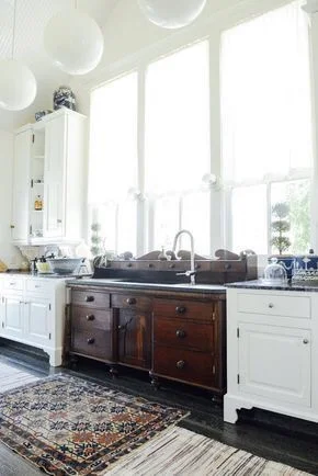 6. Upcycle. Maybe you have a beautiful sideboard but have nowhere to put it or it doesn't go with existing furniture- try using it in your kitchen as part of your sink and countertop or in your bathroom for storage. These pieces can really elevate your home to have a well designed, custom feel.